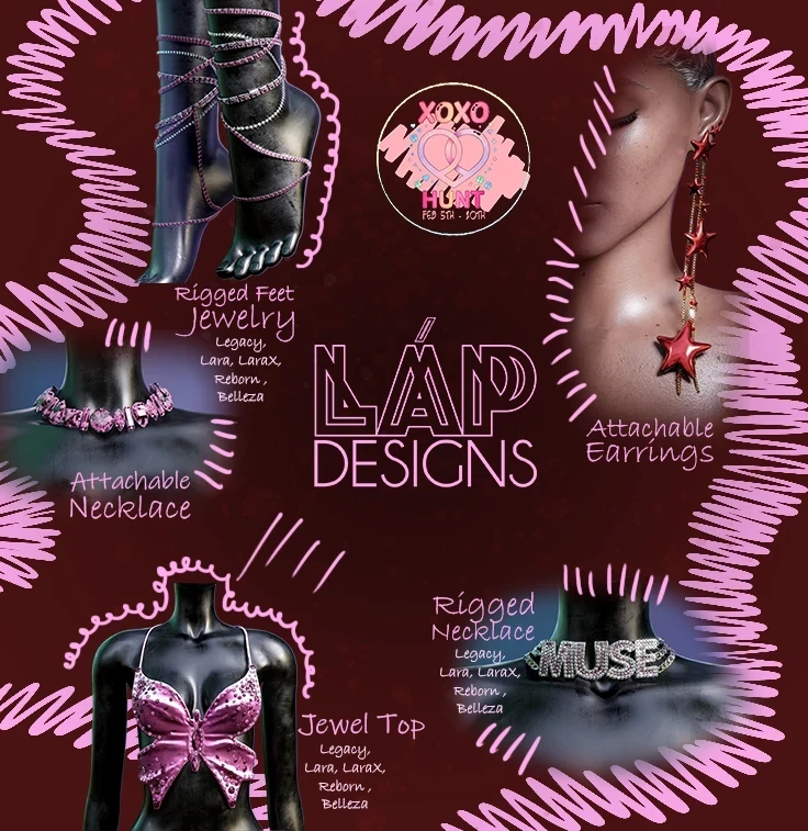 Mmmkay, we’re heading back to the days of sparkly jeans and butterfly everything (which I am more than ok with, obviously). I feel like I’m about to do a choreo to Britney Spears… which I am also.. more than ok with. Annnnnyway – the XOXO hunt has just kicked off, and there are some great prizes to hunt for. I went over to LAP to hunt for the hidden hearts, each will set you back just 25L. I grabbed the top and earrings, but I was also pleased to find these matching jeans for free– just join the Hints and Hunts group and click on the gift box on the counter. Yay for that!