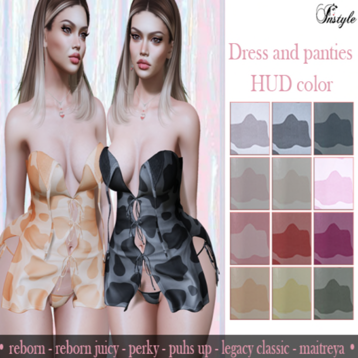 It feels odd not to be wearing an outfit that doesn’t scream Christmas or the Holidays. This is another one that sparkles. The Aspen outfit is the Jumo gift from December 14th. It comes in three pieces: top, sleeves, and skirt. A nice hud with a variety of both solid and print colors & an assortment of metal colors is included. This is such a nice gift!
