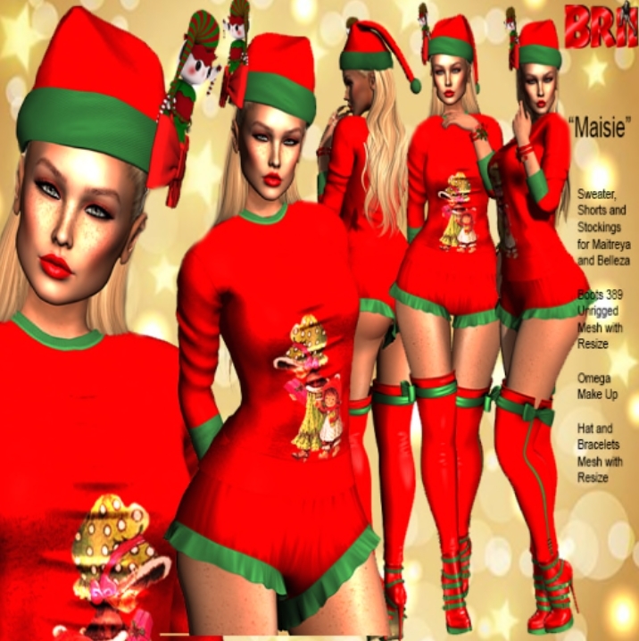I have shown items from the Synnergy store group and the Instyle HoHo hunt in my last few posts. Doesn’t matter if you read them because I am telling you about them again. The Synnergy group is free to join and has a free gift for each day in December. Previous days’ gifts are also available. I’m posing in front of the Dark Christmas backdrop gift. If you’re into SL photography this is a great group to be. You’ll get backdrops and poses as gifts throughout the year.